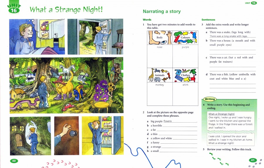 In this sample lesson, there is a picture story in which a boy opens the fridge during the night and finds a fantasic world inside. The lesson encourages the learners' to include plenty of descriptive detail in their narratives. The sample also shows how learners are encouraged to review their own work after writing. You can see the teacher's notes for this lesson on the page Pen Pictures Teacher's Books.
