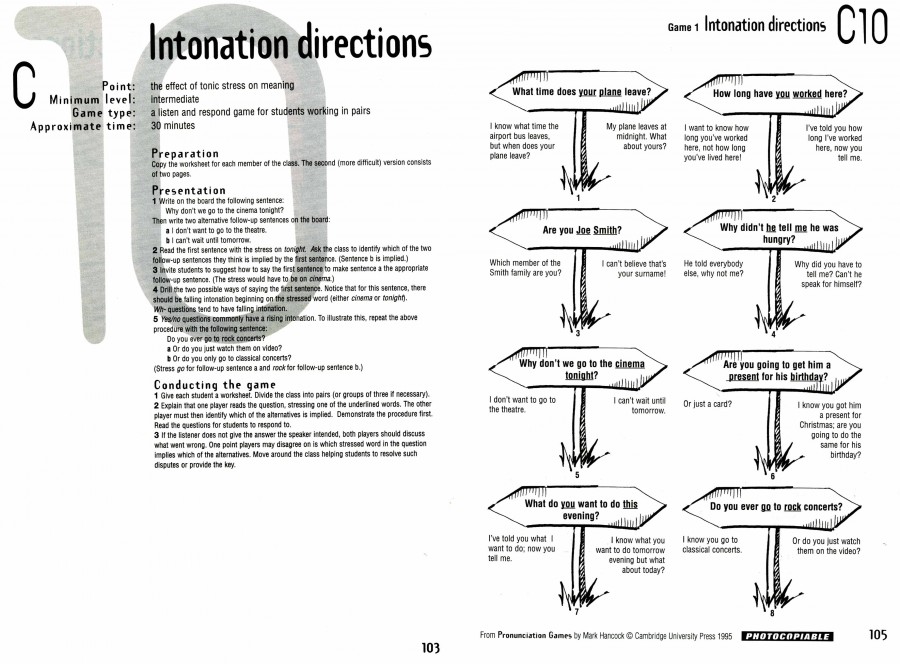 The sample lessons show: a maze - a type of puzzle in which the student finds a route from start to finish. They may pass any given word only if it has a certain pronunciation feature. You'll find more examples of this kind of puzzle in the Materials page of this site; a board game, in which students move their pieces across a board according to the stress patterns of the words in each space; and a directions game, where students try to direct a partner to the left or right according to the tonic stress they use.