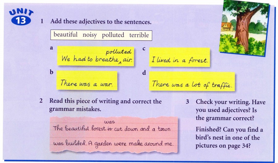 In this sample lesson, the learners see six pictures during the lifetime of a specific tree. They are asked to put themselves in the position of that tree and write their own life story. The activities in the lesson encourage them to vary the grammatical structures they use to best express the events. The sample also shows the review activity which the learners are asked to do after writing. The teacher's notes for this lesson are on the page Pen Pictures Teacher's Books, where you will also find a download of sample students' complositions for this lesson, with correction and assessment notes.