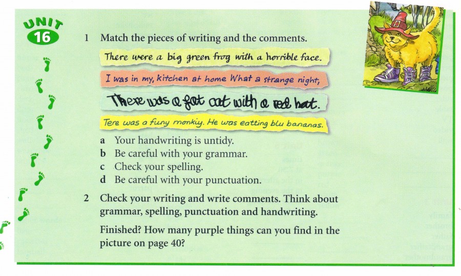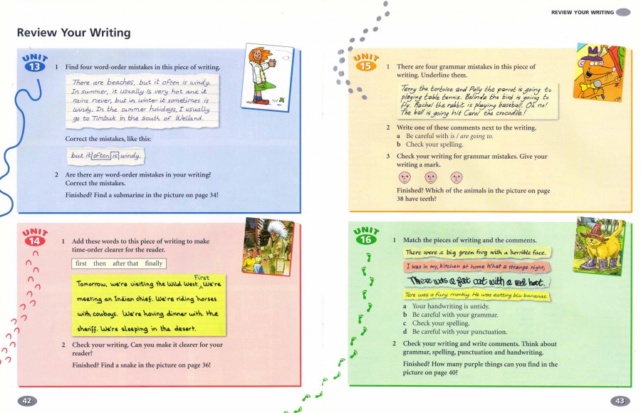 In Pen Pictures 1, pupils are given attractive visuals to fire their imagination and support them in writing a variety of different texts. These include writing a dialogue, a poem, a notice, an advert, a postcard and a short composition. For example, to help pupils write a personal introduction, they meet some very strange new kids in class, and to help them use adjectives in their descriptions, they are invitied into Count Dracula's kitchen ... topics all young learners would probably want to write home about ...