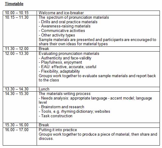 This year’s PCE is an extended workshop with the very practical goal of giving you the tools you need to make your own pronunciation materials. The rationale is that the amount and variety of material available does not match the huge interest in pronunciation. Teachers still struggle to find material which is relevant to their classrooms and can engage learners tired of endless minimal pairs and tongue-twisters. Resourceful teachers often end up having to make their own pronunciation materials but this can be a frustrating and time-consuming process without skills in material design. The aim of ‘Creating pronunciation materials’ is to put teachers in a position to evaluate and adapt existing materials and then produce their own materials. Led by Mark Hancock, an expert in the design of pronunciation materials with many key publications in the area, participants will get hands-on experience of designing materials which suit their own needs with plenty of feedback and encouragement on the way. New and experienced teachers alike will find this PCE a fantastic personal development experience with a very real outcome, a set of materials which can be shared amongst colleagues and members. Download the timetable for the day below...