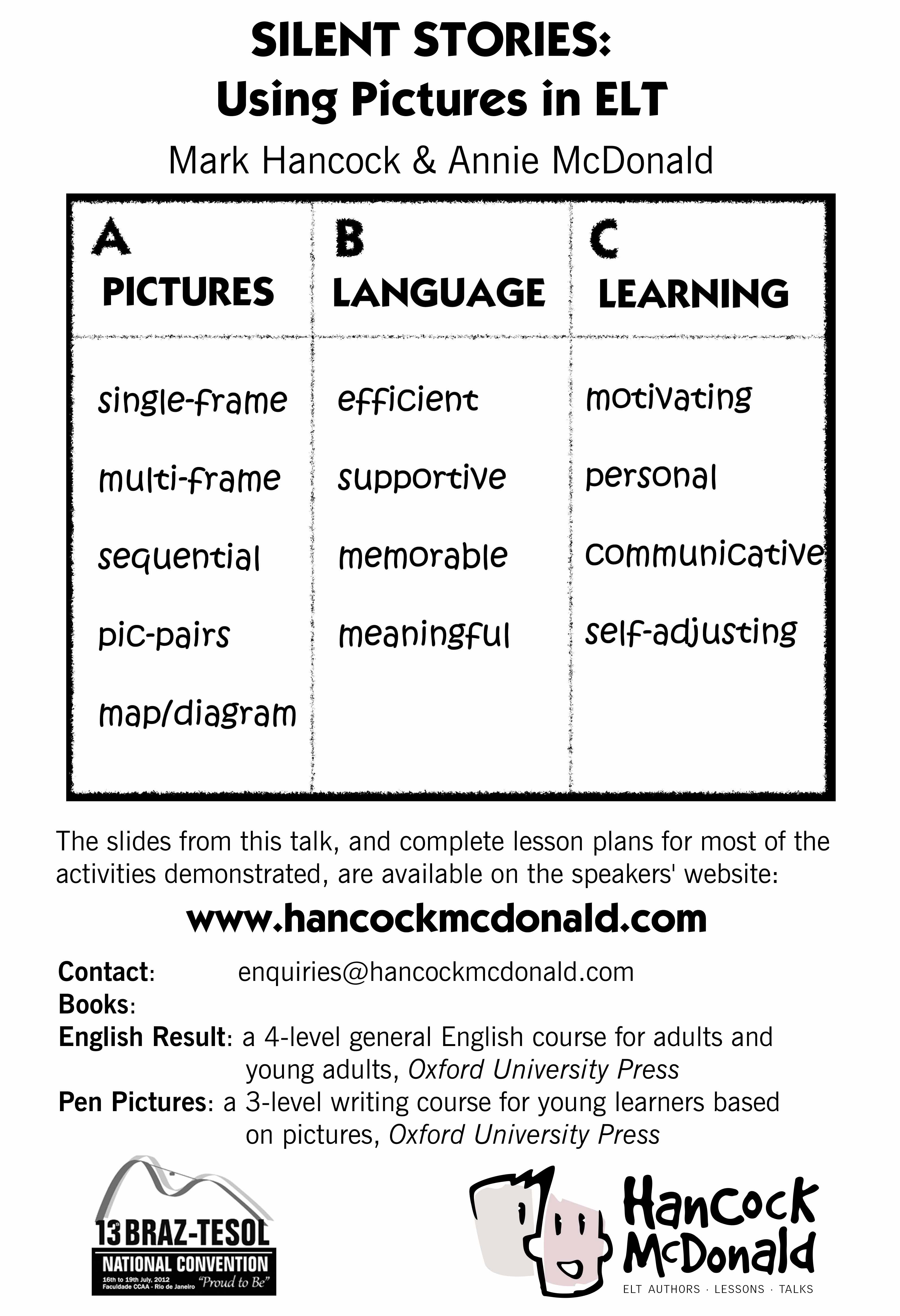 Pictures are like silent stories. Silent because they are non-verbal. Stories, because they are pregnant with content to talk about. For these two reasons alone, they are extremely useful in English language teaching. In this talk, we explain these and more advantages of pictures, as well as demonstrating different activity types for use in the classroom. You can dowload, below, the slide show with all the pictures and texts from the talk. There are also videos of the talk. And here are direct links to complete lesson plan notes for some of the activities in this talk: